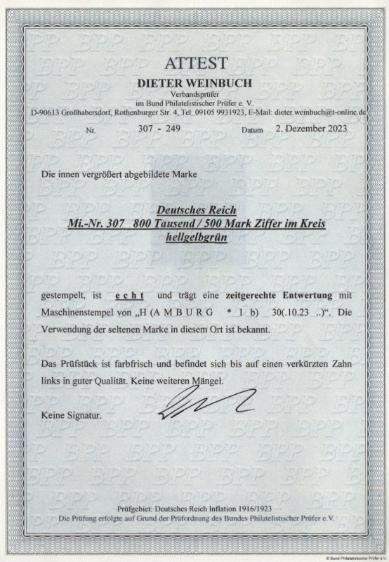 DR, Infla, 1923, Mi.- Nr.: 307, gestempelt, akt. FA Weinbuch BPP: echt und ....! Gutes Bedarfsstück! Sehr selten!