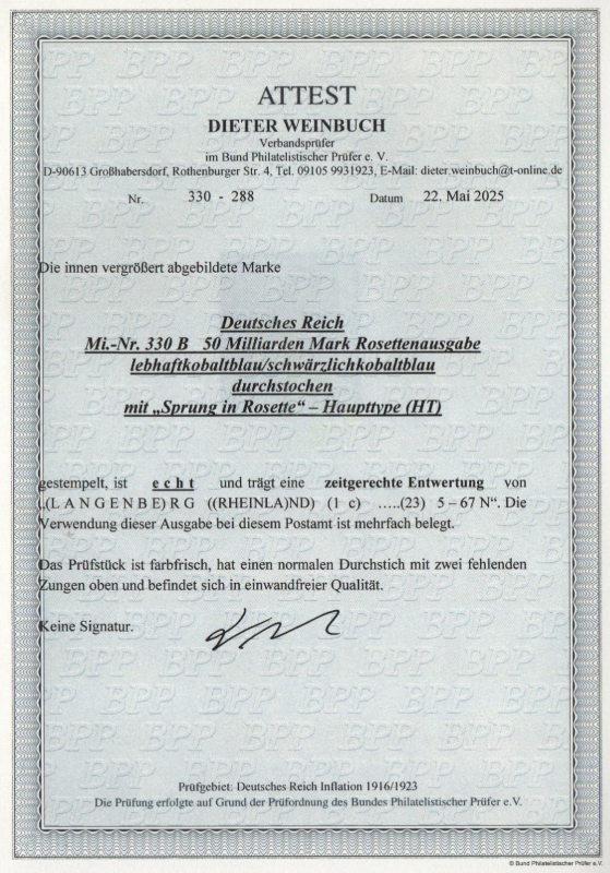 DR, Infla, 1923, Mi.- Nr.: 330 BP (HT), gestempelt, akt. Attest Weinbuch BPP: "echt und ..., e."! Bedarfsstück! Sehr selten!