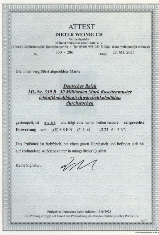 DR, Infla, 1923, Mi.- Nr.: 330 BP, gestempelt, akt. Attest Weinbuch BPP: echt und ...! Bedarfsstück! Sehr selten!
