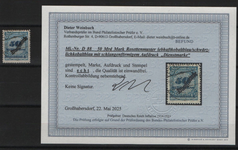 DR, Infla, 1923, Mi.- Nr.: D 88, gestempelt, akt. Befund Weinbuch BPP: echt + einwandfrei! Luxusstück, selten!