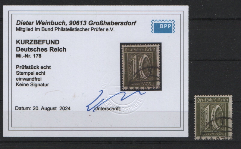 DR, Infla, 1922, Mi.- Nr.: 178, gestempelt, akt. K.- Befund Weinbuch BPP: "echt und einwandfrei"! Selten!
