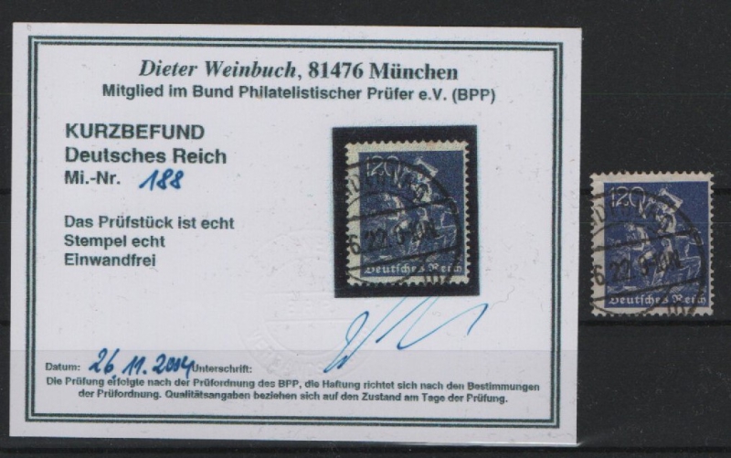 DR, Infla, 1922, Mi.- Nr.: 188, gestempelt, Luxusstück, K.- Befund Weinbuch BPP: "echt und einwandfrei"! Selten!