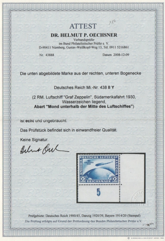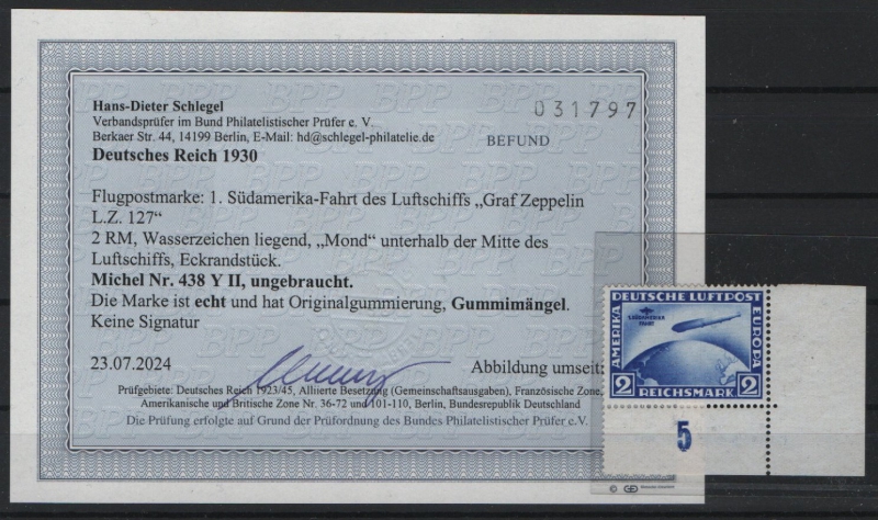 DR / Weimar, 1930, Mi.- Nr.: 438 Y Plf.: II, " 2 Mk. Süd- Amerikafahrt", *, mit Er! Akt. Befund Schlegel / FA Dr. Oechsner BPP! Sehr selten!